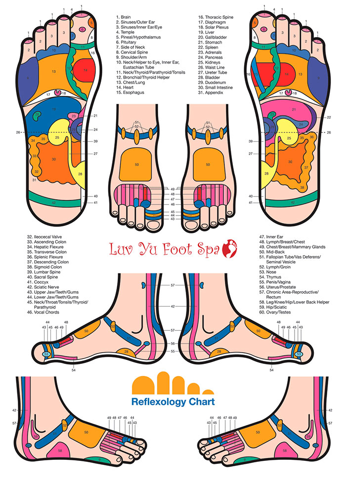 The important step to a full understanding of reflexology techniques is an appreciation of the pressure points and zones and how they relate to the body. The following reflexology diagram shows the map of points and zones.